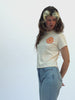 This women's t-shirt features a boxy, slightly cropped fit with short sleeves. It sits comfortably at the waist.